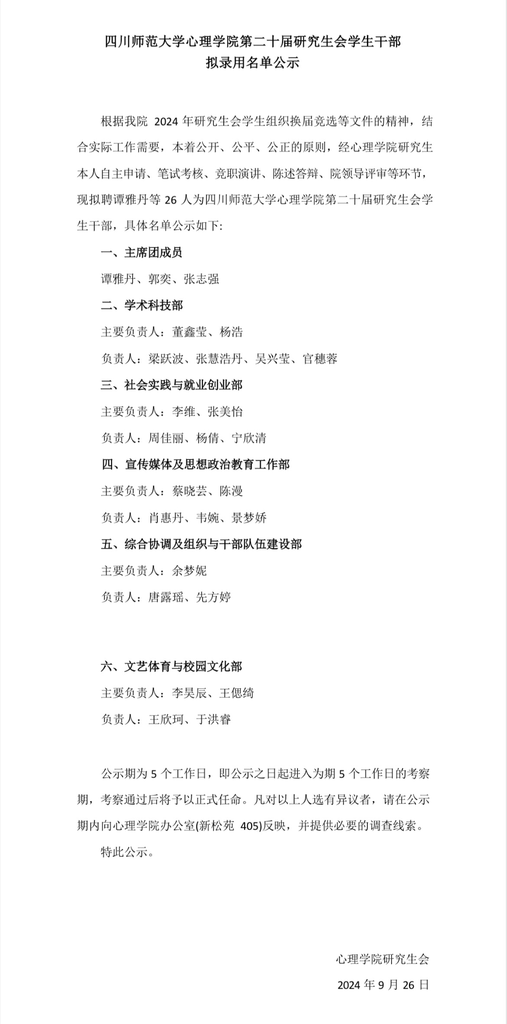 根据必赢2024年研究生会学生组织换届竞选等文件的精神,结合实际工作需要,本着公开、公平、公正的原则,经必赢国际437官网研究生本人自主申请、笔试考核、竞职演讲、陈述答辩、院领导评审等环节,现拟聘谭雅丹等26人为必赢国际437官网第二十届研究生会学生干部,具体名单公示如下: