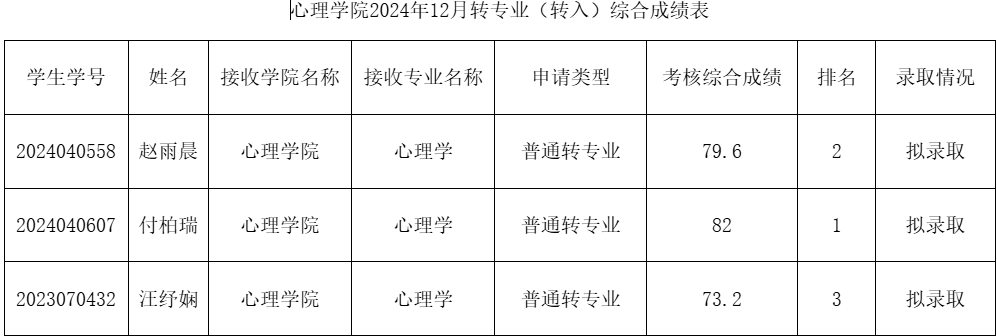 必赢国际437官网2024年12月转专业(转入)拟录取名单公示如下: