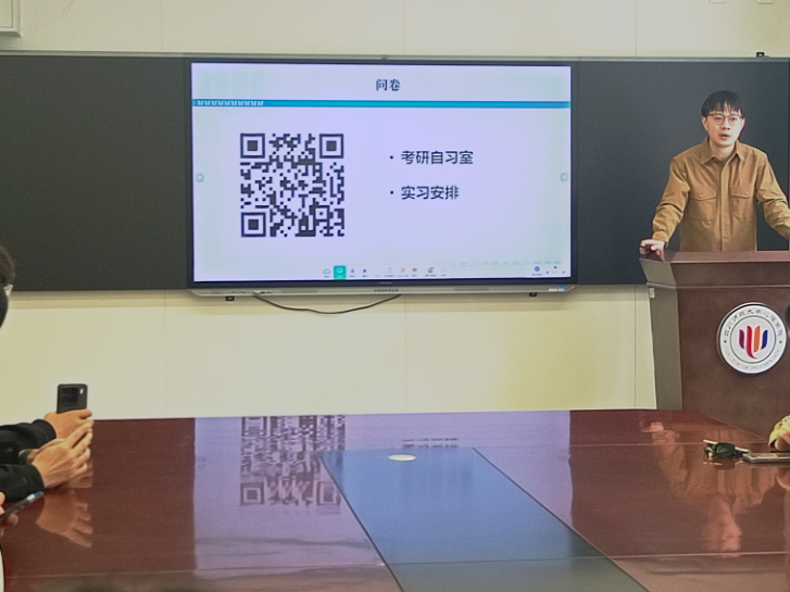 会上,蓝海通过播放安全警示教育视频,重点强调了劳动节期间的各类安全防范注意事项,并普及了国家安全及保密安全相关知识。针对实习与考研现状,他以毕业年级真实数据为基础,深入分析了读研深造与直接就业这两种选择各自的优势与挑战。为了更准确地了解同学们对毕业去向的规划,他利用问卷对大家的目标院校,实习岗位等情况进行了现场调研。