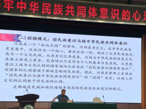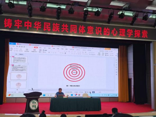 张积家教授以 “铸牢中华民族共同体意识的心理学探索” 为题,深入剖析了相关前沿学术问题。他系统阐述了中华民族共同体认同所包括的个体认同、民族认同、中华民族共同体认同和人类命运共同体认同这四个层次,并从认知、情感、行为层面详细解读了中华民族共同体认同的心理表征,探讨了增强认同的诸多因素。张积家教授提出,可以采用容器隐喻和差序格局的方式研究中华民族共同体认同有关理论与实践课题,他介绍了带领团队开展相关研究的进展。张积家教授指出,民族意识与中华民族共同体意识既相互关联又存在不同,两者的强弱关系可以分为强弱、双强、弱强、双弱四种模式,准确把握两者关系是铸牢中华民族共同体意识的必然要求。