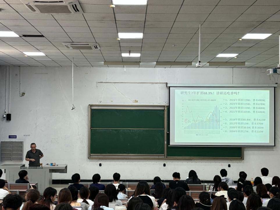 靳宇倡在讲话中指出,当前就业形势复杂且竞争愈发激烈,考研已成为提升学历、增强个人竞争力和职场话语权的有效途径。他鼓励同学们大胆瞄准学术氛围好、师资硬件条件强的各类优质高校,通过更高的平台实现职业发展理想。
