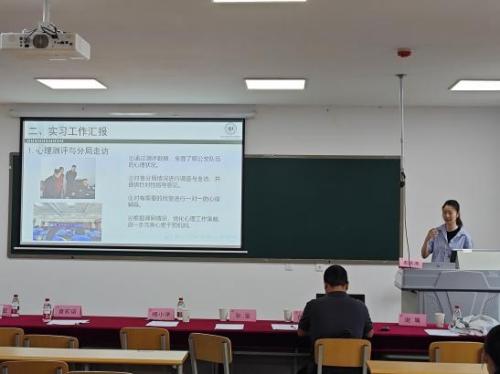 各实习点学生代表依次总结实习工作。高校组汇报了具体工作内容、项目活动参与情况及实习体会;医院组重点分享临床心理评估、干预等特色工作经历,并交流了医院环境的挑战与应对;公安系统组学生代表介绍了协助未成年人保护课程设计、参与“卓越教官训练营”、辅助招聘等工作,分析了实习局限性及未来展望;中学一组、二组汇报了听课、备课、授课及组织心理活动经历;小学组分享了独立授课、活动组织、个体辅导等成果与实习感悟。